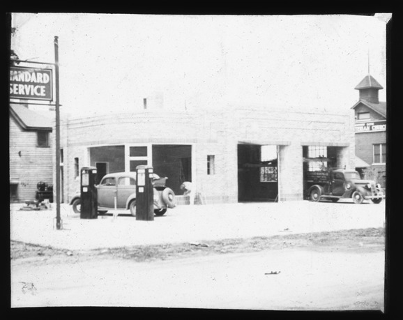 View of an unidentified service station, in Center Line, Michigan, a car stands at one of the two gas pumps and a truck sits in an open bay, on a sign appears to be the words, "Standard service". Recorded in lantern slide ledger: "M/Loc.-Centerline."