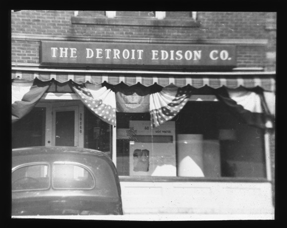 Favorite this☆ Detroit Edison Company in Center Line, Michigan Description: View of the front window and entrance of the Detroit Edison Company in Center Line, Michigan, with an automobile parked in front of building. Recorded in lantern slide ledger: "M/Loc.-Centerline." Details Resource ID: EB02m304 Subject: Electric utilities--Michigan--Center Line Commercial buildings--Michigan--Center Line Detroit Edison Company--Buildings Lantern slides Date Issued: Unknown year Format: 1 transparency : glass ; 3 x 4 in. Member of: Burton Historical Collection Negative Number: BHC lantern slide no. 1150 Rights: Physical rights are retained by DPL. Copyright is retained in accordance with U.S. copyright laws.