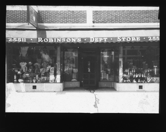 Favorite this☆ Robinson's Department Store in Center Line, Michigan Description: View of the storefront of Robinson's Department Store in Center Line, Michigan, with products arranged in front windows. Recorded in lantern slide ledger: "M/Localities-Centerline." Details Resource ID: EB02m305 Subject: Department stores--Michigan--Center Line Lantern slides Date Issued: Unknown year Format: 1 transparency : glass ; 3 x 4 in. Member of: Burton Historical Collection Negative Number: BHC lantern slide no. 1151 Rights: Physical rights are retained by DPL. Copyright is retained in accordance with U.S. copyright laws.