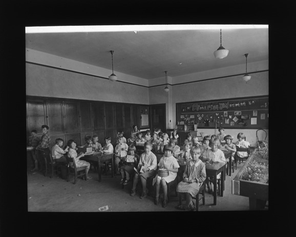 Children sitting at their tables with their teacher sitting behind them at Wilson School in Ferndale, Michigan. Recorded in lantern slide ledger: "M/Localities-Ferndale (Wilson School)."