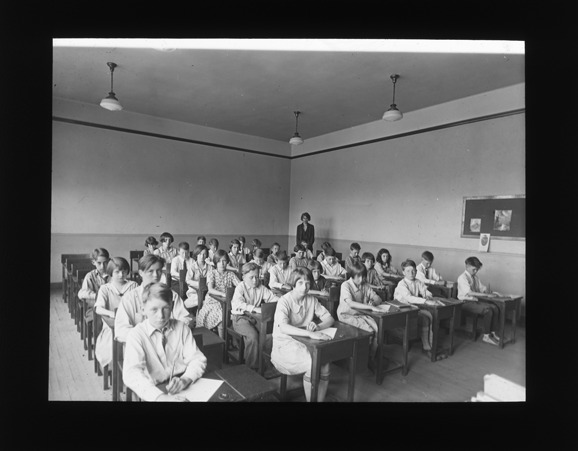 Children sitting at their desks with their teacher standing behind them at Wilson School in Ferndale, Michigan. Recorded in lantern slide ledger: "M/Localities-Ferndale (Wilson School)."