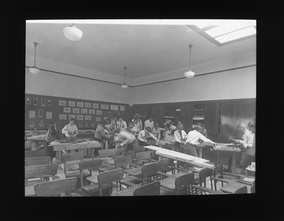 Favorite this☆ Woodshop class at Wilson School in Ferndale, Michigan Description: Schoolboys attending woodshop class, at Wilson School in Ferndale, Michigan. Recorded in lantern slide ledger: "M/Localities-Ferndale (Wilson School)." Details Resource ID: EB02m337 Subject: School shops--Michigan--Ferndale Classrooms--Michigan--Ferndale Elementary schools--Michigan--Ferndale Lantern slides Date Issued: Unknown year Format: 1 transparency : glass ; 3 x 4 in. Member of: Burton Historical Collection Negative Number: BHC lantern slide no. 1183 Rights: Physical rights are retained by DPL. Copyright is retained in accordance with U.S. copyright laws.