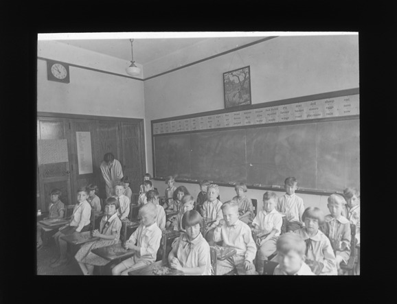 Children sit at their desks with their teacher standing at side of the room at Wilson School in Ferndale, Michigan. Recorded in lantern slide ledger: "M/Localities-Ferndale (Wilson School)."
