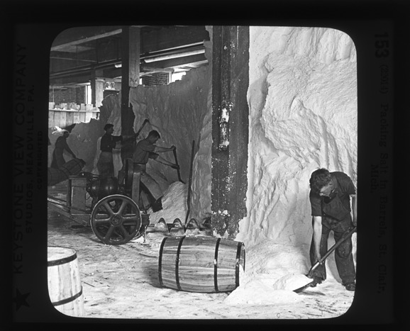 Salt miner shovels salt into a barrel in foreground, other men scrape salt from mine wall in background in Saint Clair, Michigan. Recorded in lantern slide ledger: "M/Localities-Packing salt in barrels, St. Clair, Mich."