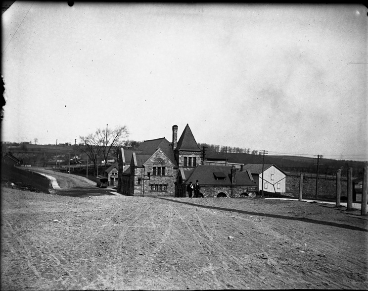 View of the Michigan Central Railroad Depot in Ann Arbor, Michigan. The building was designed by Frederick Spier and built in 1886 using two feet thick granite blocks. Recorded in glass negative ledger: "M/Localities-Ann Arbor."