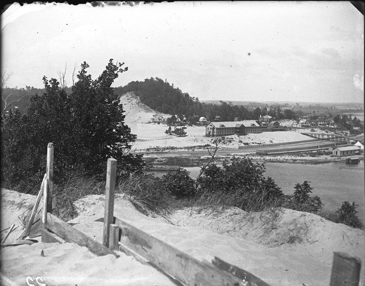 Bird's-eye view of the Hotel Ottawa with train tracks and a view of the lake in foreground, at Ottawa Beach, near Holland Michigan. Recorded in glass negative ledger: "M/Localities-Ottawa Beach, airview."