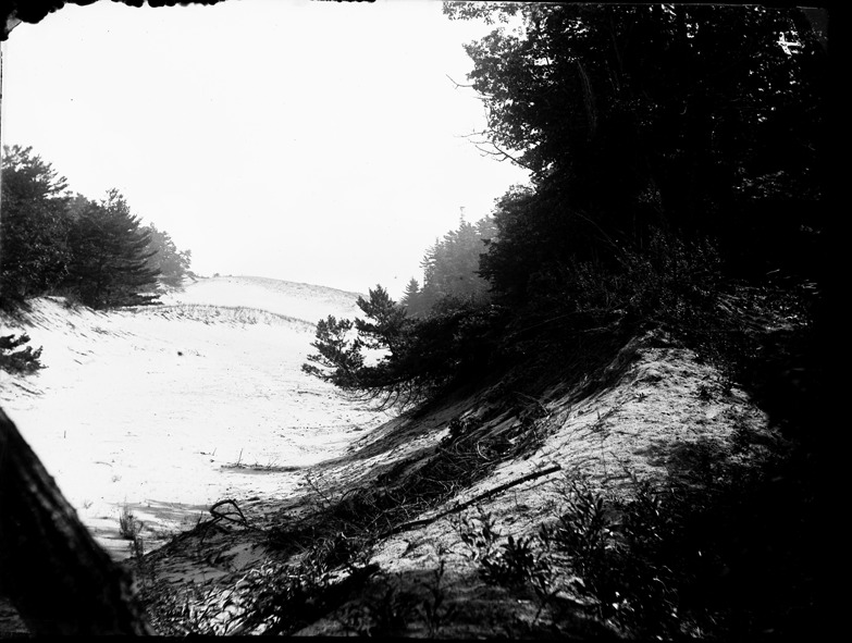 Sand dunes at Ottawa Beach, near Holland, Michigan. Recorded in glass negative ledger: "M/Localities-Ottawa Beach, beach."