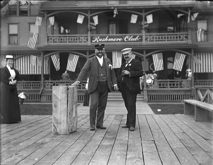 Two men pose in front of the Rushmere Club, which is decorated with American flags, at the St. Clair Flats, Michigan. Recorded in glass negative ledger: "M/Localities-St. Clair Flats."