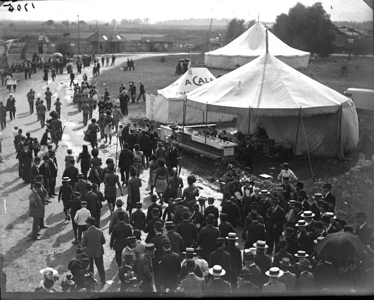 Favorite this☆ Crowd at fairgrounds Description: Large crowd walks on road near tents, with buildings in background. Recorded in glass negative ledger: "M/State Fair." Details Resource ID: EB02m562 Subject: Michigan State Fair Tents--Michigan Crowds--Michigan Glass negatives Date Issued: Unknown year Format: 1 negative : glass ; 4 x 5 in. Member of: Burton Historical Collection Negative Number: BHC glass neg. no. 591 Rights: Physical rights are retained by DPL. Copyright is retained in accordance with U.S. copyright laws.