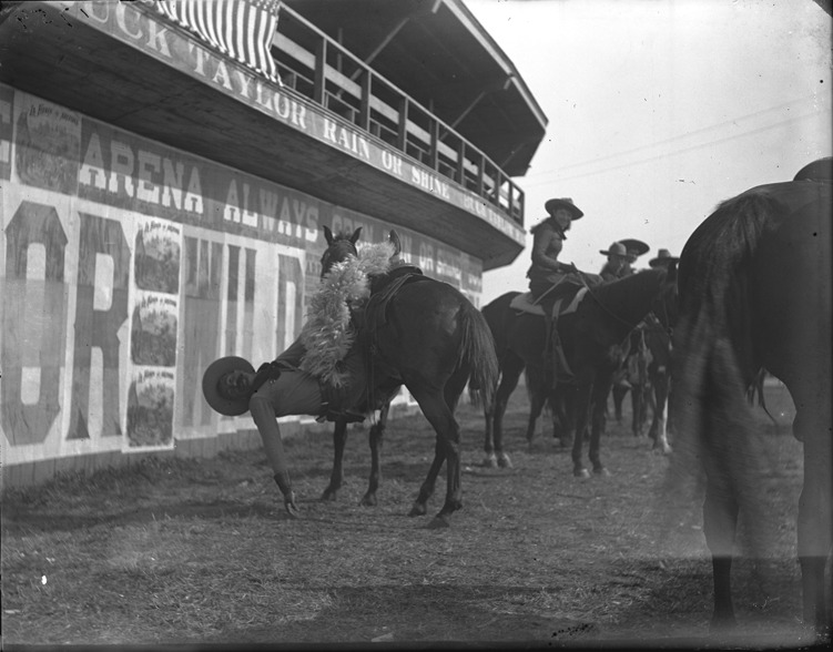 Cowboy from Buck Taylor's wild west show performs trick on horse while waiting to perform at the Michigan State Fair. Buck Taylor was with Buffalo Bill's wild west show before starting his own company. Recorded in glass negative ledger: "M/State Fair."