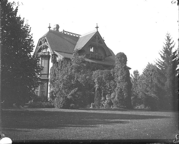 View of "Tonnancour" the residence of Theodore Parsons Hall, a Victorian Swiss chalet style mansion in Grosse Pointe, Michigan, with a path leading up to house and trees. Tonnancour was designed by Mortimer L. Smith and built in 1880. Recorded in glass negative ledger: "M/Localities-Grosse Pointe-Historic houses-Hall, Theodore Parsons."