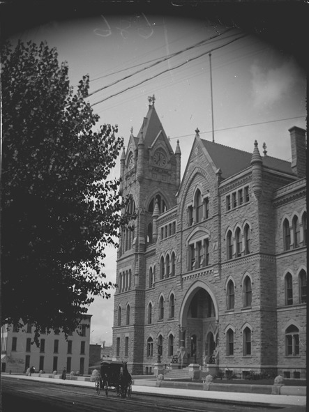 View of stone building with clock tower and arched windows; horse and buggy in street.