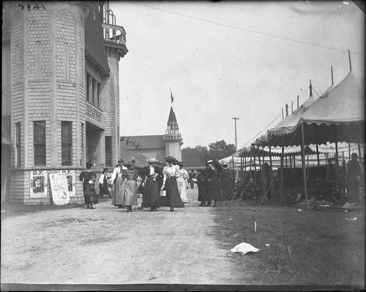 Favorite this☆ Women at State Fair Description: Women wearing hats and long skirts walk along road at State Fair; shingled building on one side of road, tents on the other side. Building with two steeples in background. Recorded in glass negative ledger: "M/State fair." Details Resource ID: EB02m658 Subject: Michigan State Fair Exhibition buildings--Michigan--Detroit Glass negatives Date Issued: Unknown year Format: 1 negative : glass ; 4 x 5 in. Member of: Burton Historical Collection Negative Number: BHC glass neg. no. 2080 Rights: Physical rights are retained by DPL. Copyright is retained in accordance with U.S. copyright laws.