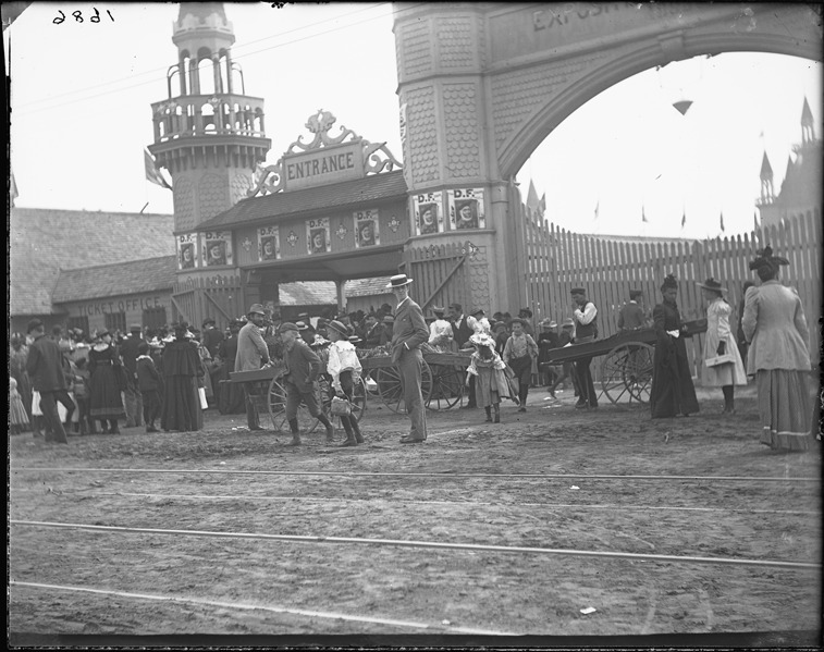Favorite this☆ Entrance to Michigan State Fair Description: View of entrance gate to fairgrounds; large shingled arch with wooden fence; ornate cupola; decorative woodwork over entrance sign; crowds gather at entrance; vendors with carts in foreground. Recorded in glass negative ledger: "LM/State fair." Details Resource ID: EB02m664 Subject: Michigan State Fair Gates--Michigan--Detroit Glass negatives Date Issued: Unknown year Format: 1 negative : glass ; 4 x 5 in. Member of: Burton Historical Collection Negative Number: BHC glass neg. no. 2086 Rights: Physical rights are retained by DPL. Copyright is retained in accordance with U.S. copyright laws.