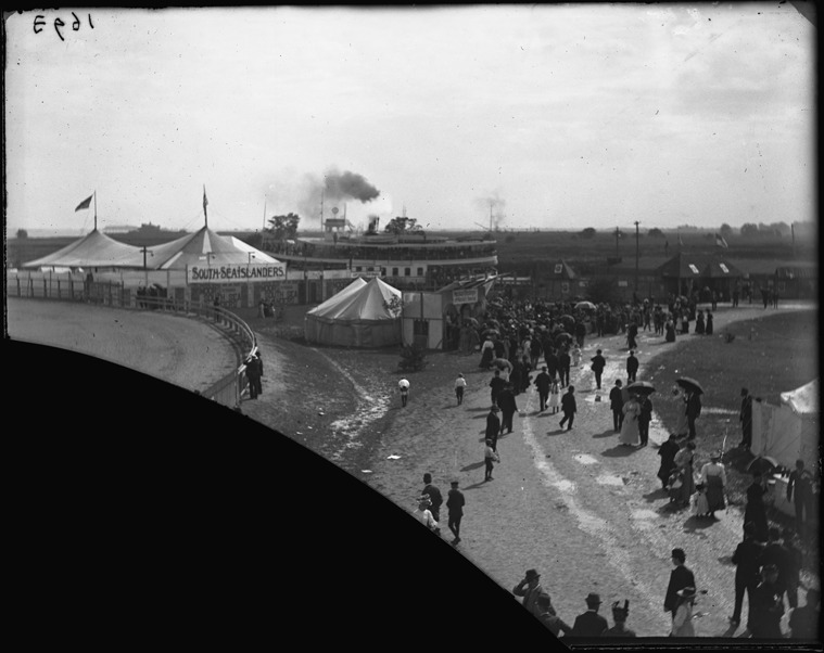 Aerial view of fairgrounds with buildings and tents visible in the background and a crowd gathered around some sort of entertainment, a roadway runs through the foreground and in distant background a large excursion boat is docked. Recorded in glass negative ledger: "LM/State fair." Lower left corner of glass negative is missing.
