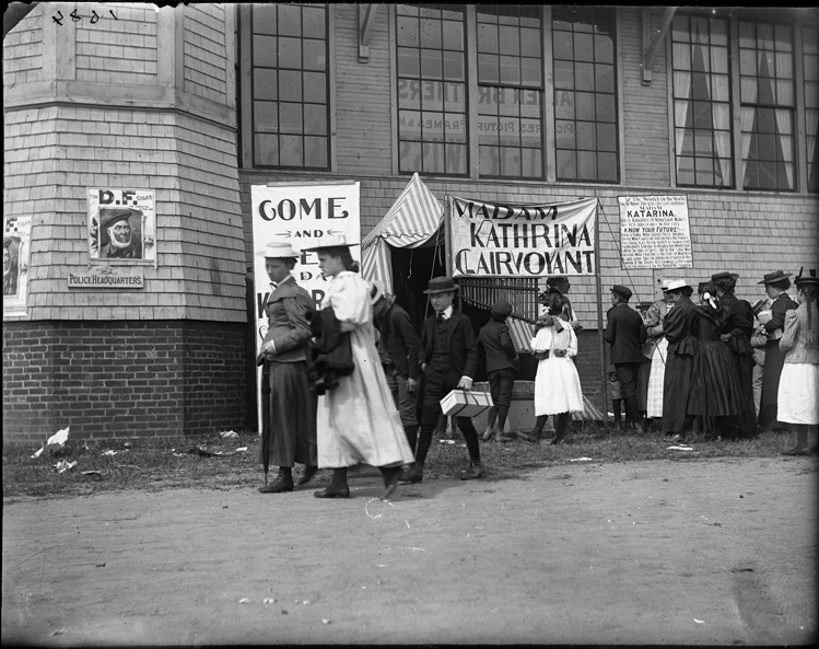 Group of women stand in front of tent for Madam Katarina, clairvoyant, at the Michigan State Fair. Banner in background reads: "Madam Kathrina, clairvoyant." Recorded in glass negative ledger: "LM/State fair."