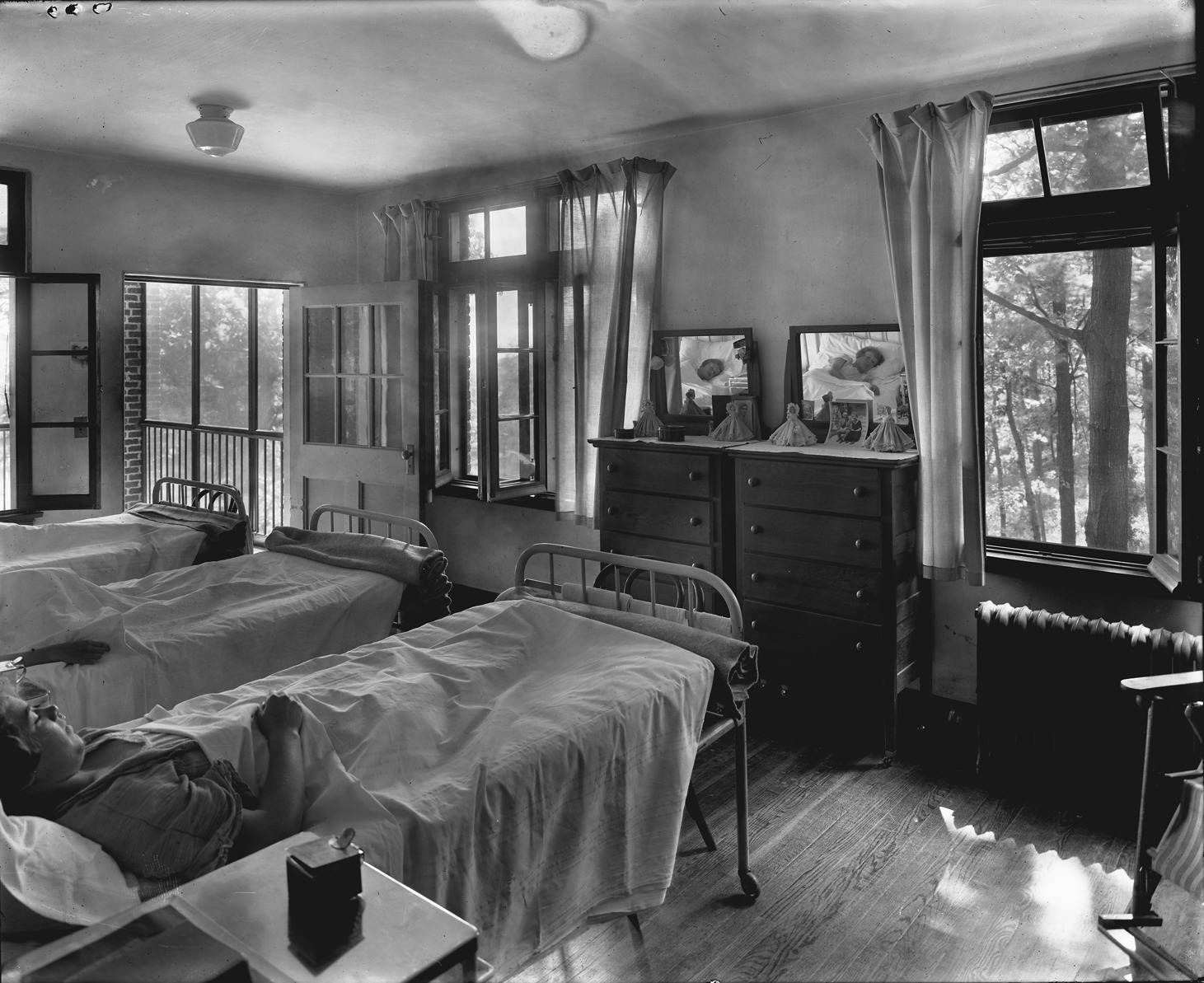 Three young girls asleep in their hospital beds, two of them reflected in mirrors above chest of drawers at foot of beds, dolls on dressers, windows open, door open to screened porch and trees visible. Recorded in glass negative ledger: "D/Hospitals-Detroit tuberculosis sanitarium."