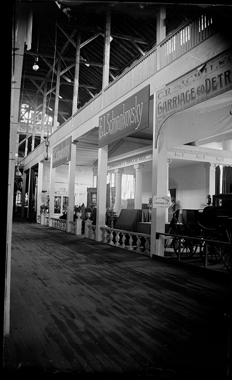 Exhibits at the Michigan State Fair including Schwankovsky's Temple of Music and the C.R. & J.C. Wilson Carriage Co. displays. Recorded in glass negative ledger: "M/State fair, 1894."