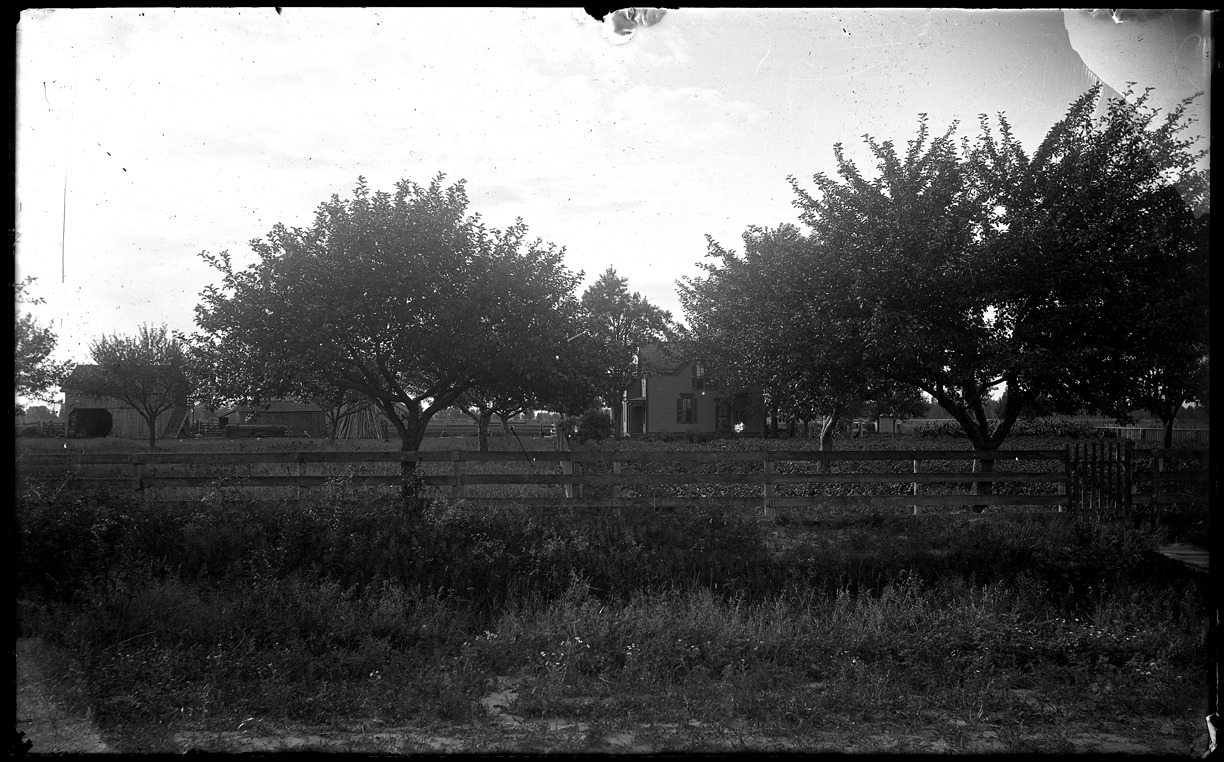 View of fruit trees against a fence; farm buildings in background. Recorded in glass negative ledger: "M/Farms."