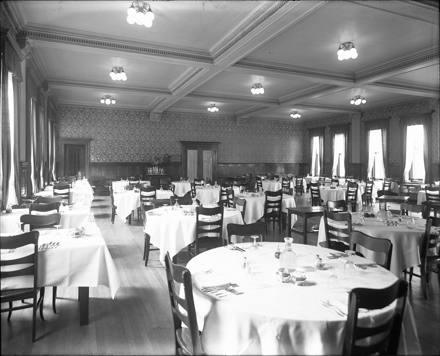 Favorite this☆ Dining room at Hotel Medea Description: View of dining room in Hotel Medea; tables set with place settings and white tablecloths; curtained windows and coffered ceiling. Recorded in glass negative ledger: "M/Localities-Mt. Clemens-Hotels-Medea (dining room)." Details Resource ID: EB02m857 Subject: Dining rooms--Michigan--Mount Clemens Hotels--Michigan--Mount Clemens Glass negatives Date Issued: Unknown year Format: 1 negative : glass ; 8 x 10 in. Member of: Burton Historical Collection Negative Number: BHC glass neg. no. 3747 Rights: Physical rights are retained by DPL. Copyright is retained in accordance with U.S. copyright laws.
