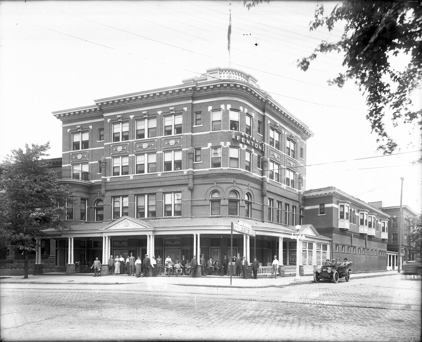 View of Fenton Hotel in Mt. Clemens; multistory brick building with gabled porch supported by columns; decorative brackets under eaves; group of people gather in front of hotel; automobile with passengers parked in street; sign on building: "Hotel Fenton." Recorded in glass negative ledger: "M/Localities-Mt. Clemens-Hotel-Fenton."