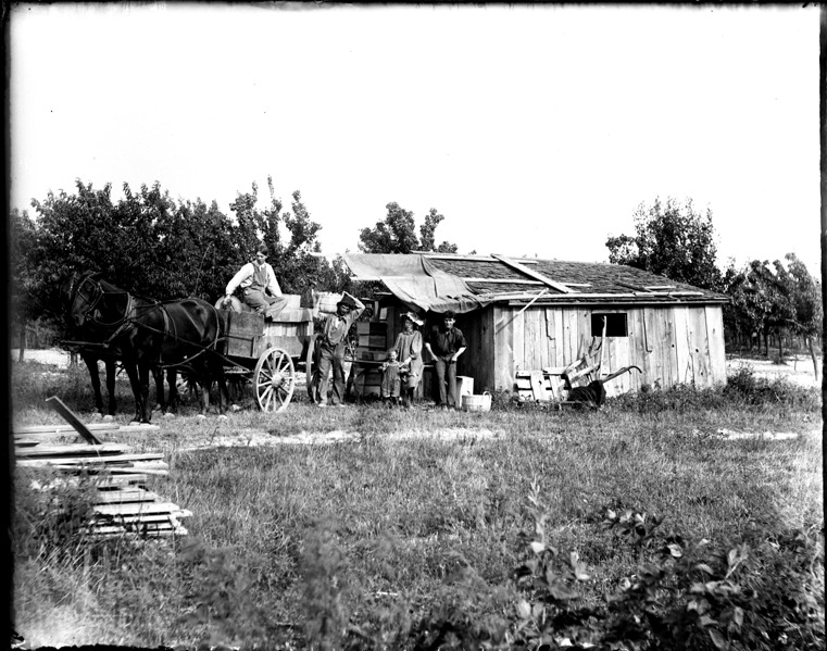 Men, woman and children gather in front of dilapidated wooden shed in an orchard; man sits in horse-drawn wagon that is loaded with boxes or crates; another man holds bushel of peaches on his shoulders. Recorded in glass negative ledger: "M/Fruit-culture, loading peaches, St. Joe, Aug. 1899."