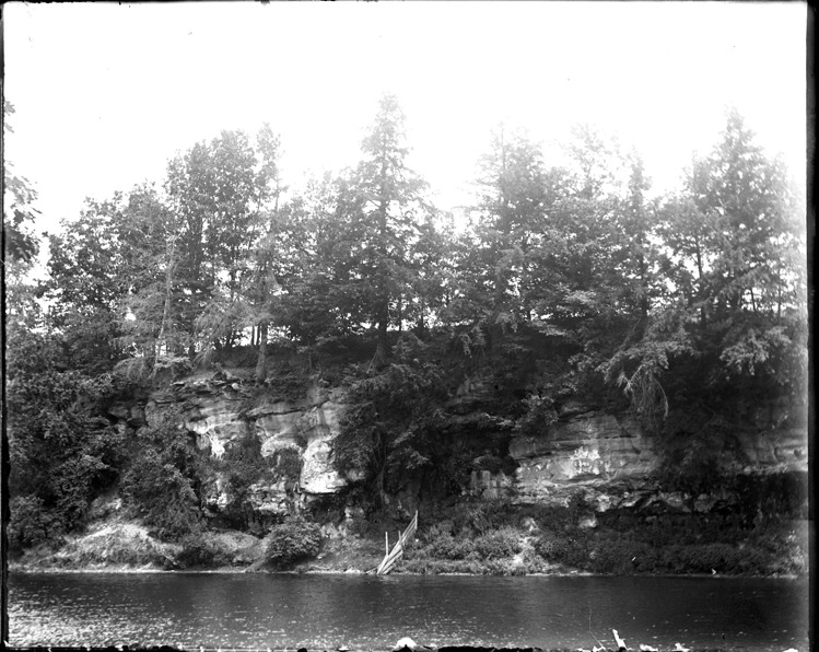 View of rock ledges or formations from river. Recorded in glass negative ledger: "M/Rocks, ledge of rocks, Grand Ledge, July 30, 1898."