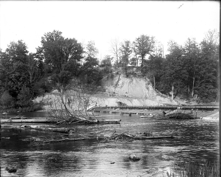 View of dam over Grand River; tree trunks in water; steep sandy bank in background. Recorded in glass negative ledger: "M/Dams, below dam, Grand Ledge, Sept. 4, 1899."