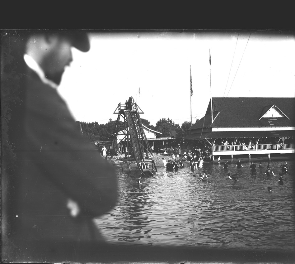 Favorite this☆ Water toboggan at Silver Beach, Saint Joseph, Michigan Description: Man in foreground watches swimmers near water slide; open-air pavilion on shore. Recorded in glass negative ledger: "M/Localities-St. Joseph, the water toboggan slide, Aug. 1900." Details Resource ID: EB02m978 Subject: Amusement rides--Michigan--Saint Joseph Swimmers--Michigan--Saint Joseph Beaches--Michigan--Saint Joseph Glass negatives Date Issued: 1900-08 Format: 1 negative : glass ; 5.75 x 6.5 in. Member of: Burton Historical Collection Negative Number: BHC glass neg. no. 3935 Rights: Physical rights are retained by DPL. Copyright is retained in accordance with U.S. copyright laws.