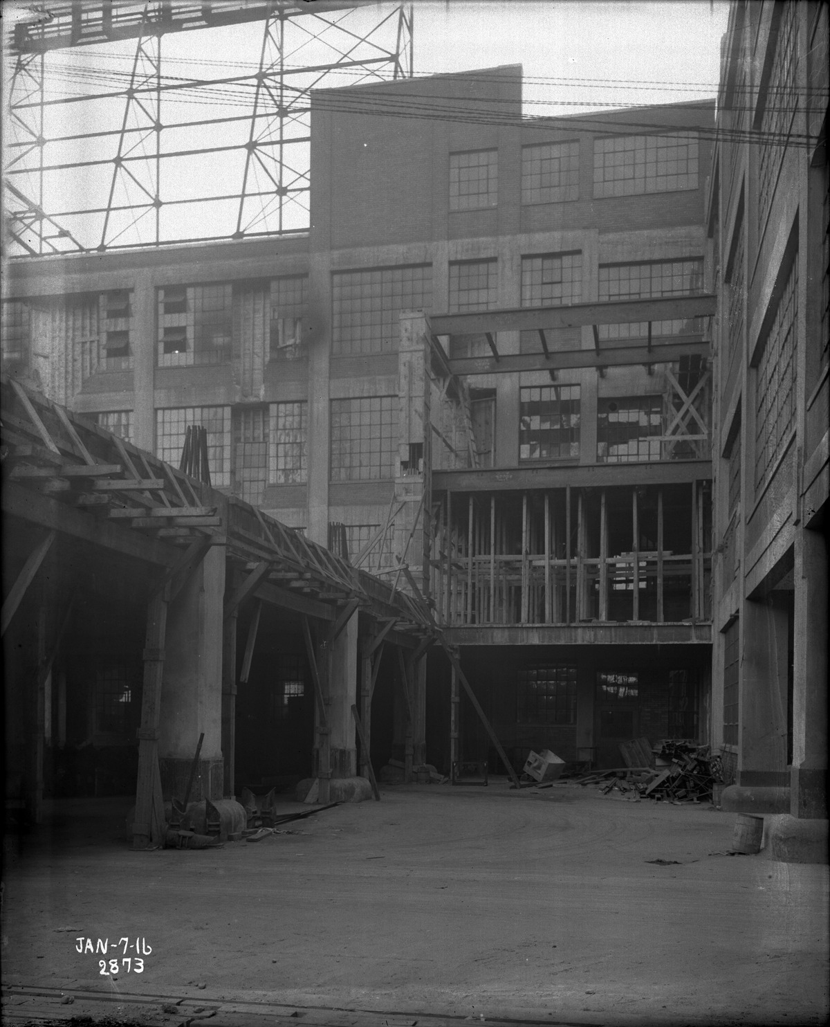 Favorite this☆ Dodge Brothers factory under construction Description: View of construction on lower level of factory; wooden supports; wire sign in background. Printed on photograph: "Jan-7-16." Recorded in glass negative ledger: "M/Automobile industry & trade-Dodge Bros., first floor addition construction." Details Resource ID: EB02n006 Subject: Dodge Brothers Building sites--Michigan--Detroit Automobile factories--Michigan--Detroit Automobile factories--Design and construction Glass negatives Date Issued: 1916-01-07 Format: 1 negative : glass ; 10 x 8 in. Member of: Burton Historical Collection Negative Number: BHC glass neg. no. 4041 Rights: Physical rights are retained by DPL. Copyright is retained in accordance with U.S. copyright laws.