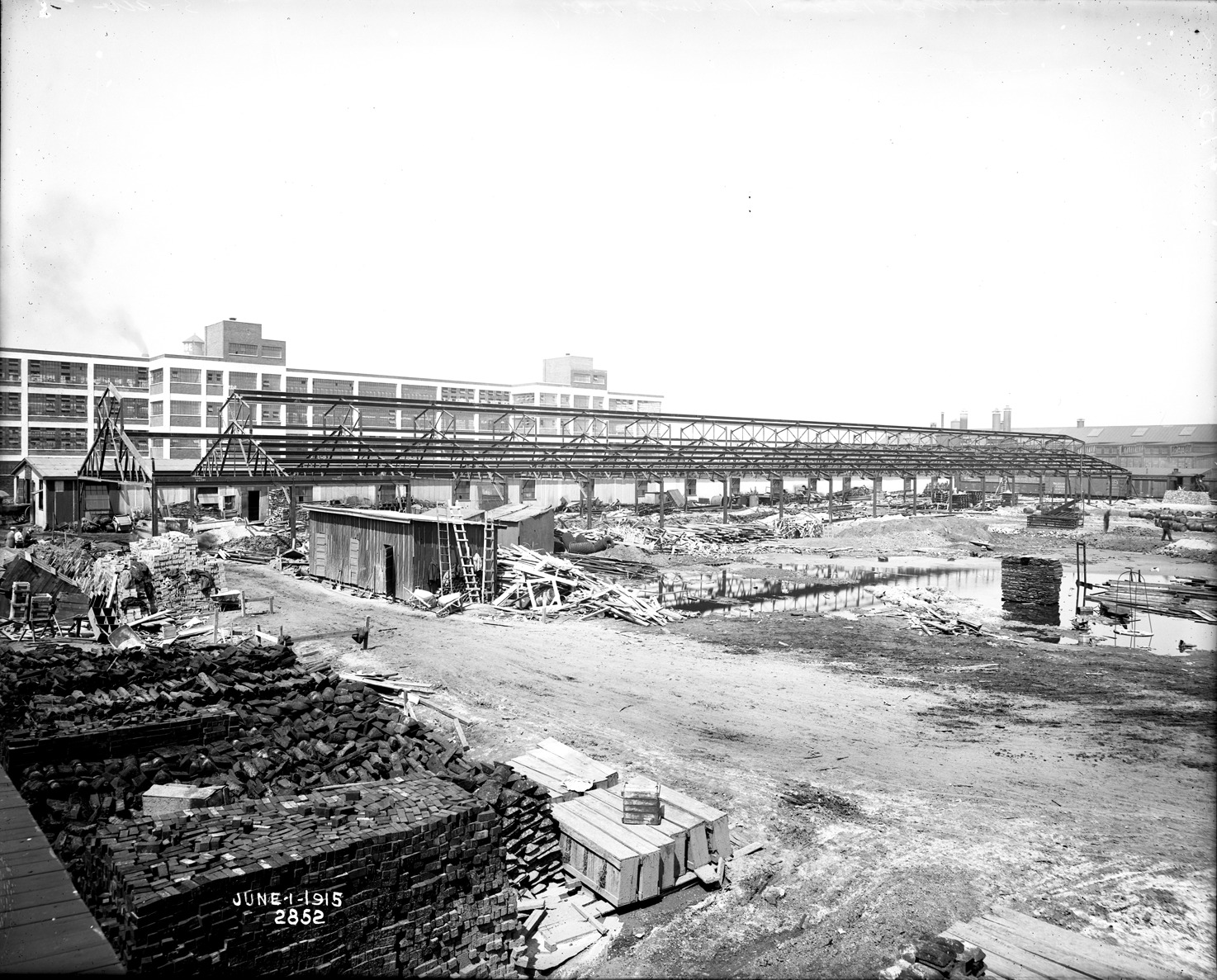 Construction site of Dodge Brothers factory; steel framework of building and roof; construction debris; piles of building materials. Printed on photograph: "June-1-15." Recorded in glass negative ledger: "M/Automobile industry & trade-Dodge Bros."