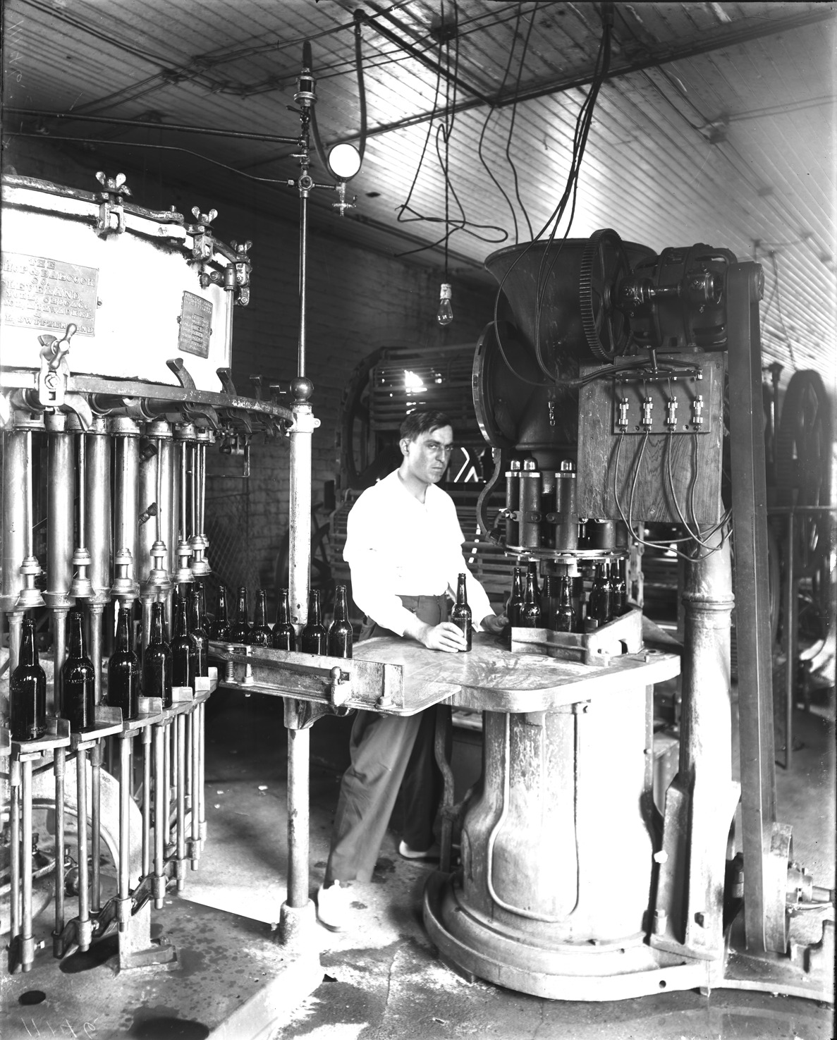 Favorite this☆ Worker at Marx Brewing Company factory Description: Man works with bottling machine at Marx Brewing Company factory. Recorded in glass negative ledger: "M/Localities-Wyandotte-Industries & business houses-Marx Brewing Co." Details Resource ID: EB02n053 Subject: Breweries--Michigan--Wyandotte Beer industry--Michigan--Wyandotte Bottling machinery--Michigan--Wyandotte Glass negatives Date Issued: Unknown year Format: 1 negative : glass ; 10 x 8 in. Member of: Burton Historical Collection Negative Number: BHC glass neg. no. 4313 Rights: Physical rights are retained by DPL. Copyright is retained in accordance with U.S. copyright laws.