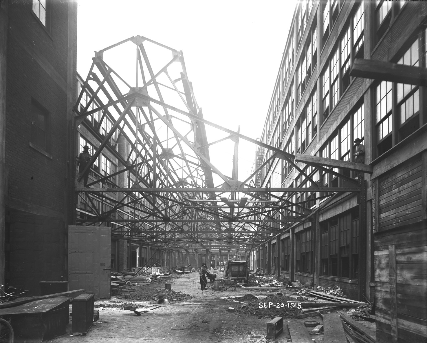 Construction site for Packard Motor Car Company; steel framework for roof; worker stands on girder; men stand below with machinery; construction debris. Printed on photograph: "Sept-20-1915." Recorded in glass negative ledger: "M/Automobile industry & trade-Packard Motor Car Co."