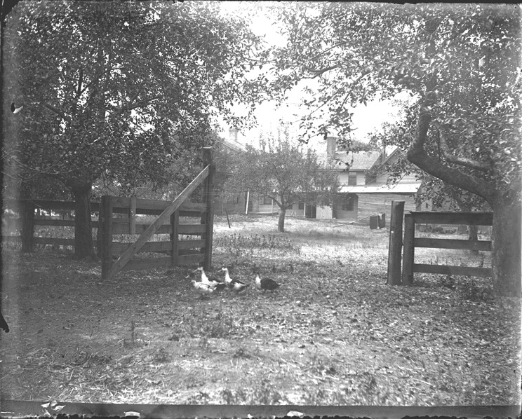 View of farmhouse with wooden fence; ducks in front of open gate; laundry hangs on clothesline. Recorded in glass negative ledger: "M/Farms."