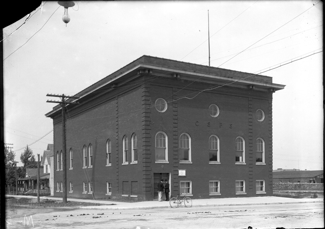 Two men stand in doorway of three story brick building with the letters, "C.S.P.S," on top. Recorded in glass negative ledger: "M/Organizations-Michigan State Grange."