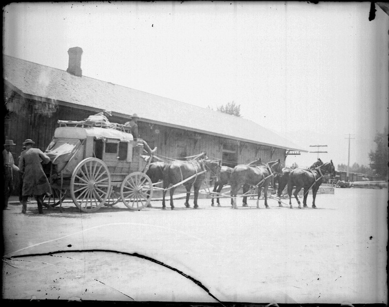 Favorite this☆ Horse-drawn stagecoach Description: View of horse-drawn stagecoach in front of wooden-frame building; men load baggage on rear of stagecoach. Recorded in glass negative ledger: "M/Transportation." Details Resource ID: EB02n119 Subject: Stagecoaches--Michigan Glass negatives Date Issued: Unknown year Format: 1 negative : glass ; 4 x 5 in. Member of: Burton Historical Collection Negative Number: BHC glass neg. no. 4667 Rights: Physical rights are retained by DPL. Copyright is retained in accordance with U.S. copyright laws.