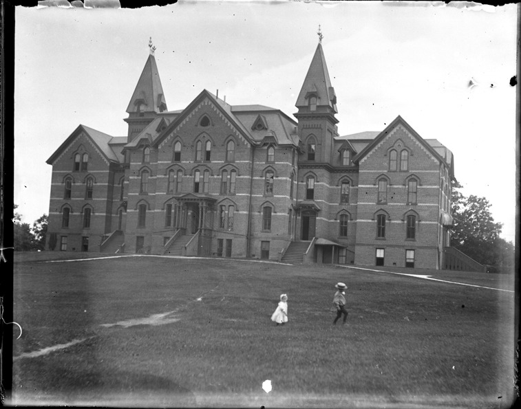 View of three-story brick building with two cupolas; several entrances with steps; window enframements; two children play on lawn in front of residence hall. Recorded in glass negative ledger: "M/Colleges & universities-Michigan Agricultural College."