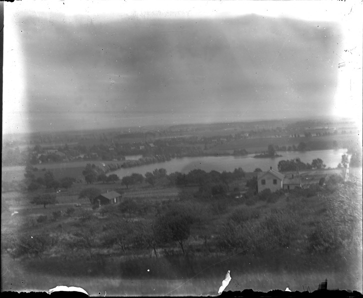 View of Snyder farm from distance; fields, trees and pond or lake. Recorded in glass negative ledger: "M/Farms-Snyder family farm-rolling countryside."