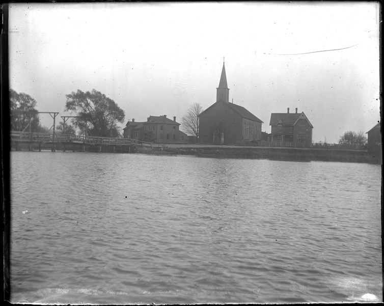 Favorite this☆ Buildings on waterfront Description: View of church and houses on shore; wooden bridge crosses water. Recorded in glass negative ledger: "M/Localities." Details Resource ID: EB02n205 Subject: Dwellings--Michigan Church buildings--Michigan Wooden bridges--Michigan Glass negatives Date Issued: Unknown year Format: 1 negative : glass ; 4 x 5 in. Member of: Burton Historical Collection Negative Number: BHC glass neg. no. 4819 Rights: Physical rights are retained by DPL. Copyright is retained in accordance with U.S. copyright laws.