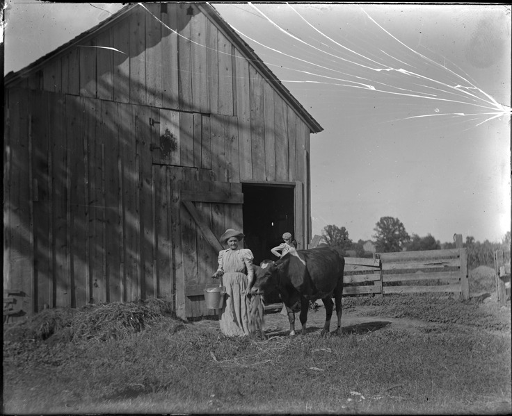 View of woman leading cow out of barn; woman holds milking bucket; another woman stands in entrance of barn. Recorded in glass negative ledger: "M/Farms." Negative is broken.
