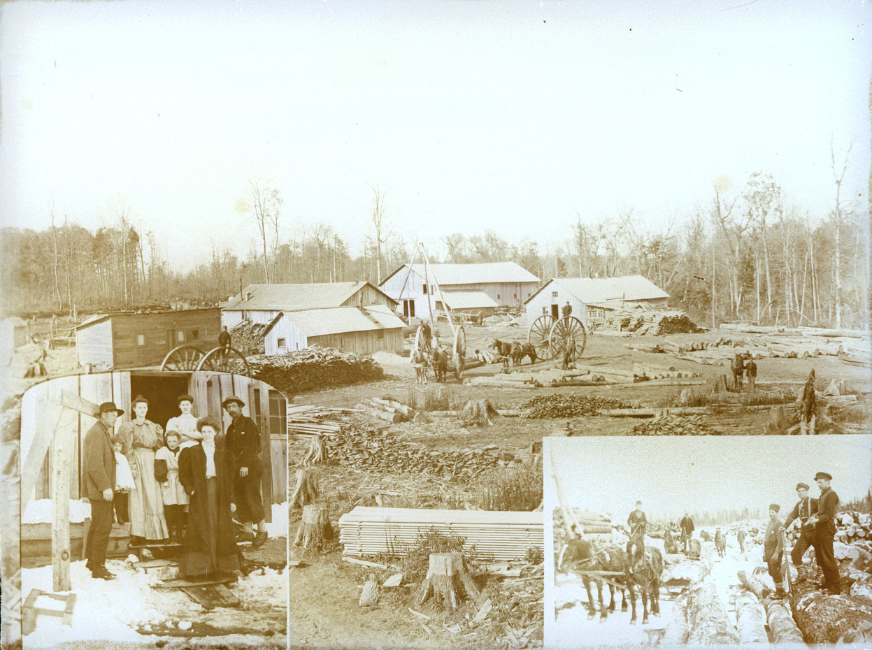 Lumber camp with large-wheeled wagons, buildings in view, photo has one inset of people standing in building doorway and other inset of lumberjacks standing on logs and horsedrawn wagons filled with logs. Photo is mounted on glass plate with painted black border. Written on photo back: "Presented to Pat Travers by Russell and Mary Blong. This photograph taken about 1905 at Onaway, Michigan at McKays Lumber Camp & Sawmill. I worked there 1907--NOTE big wheels and log sleighs, means of transportation to mills. Patrick Earl Travers, 2nd husband of Mildred Wotring, mother of Dr. Harold F. Powell." Recorded in glass negative ledger: "M/Lumber-Industry & trade, McKay's Lumber Camp & Sawmill, Onaway, c.1907."