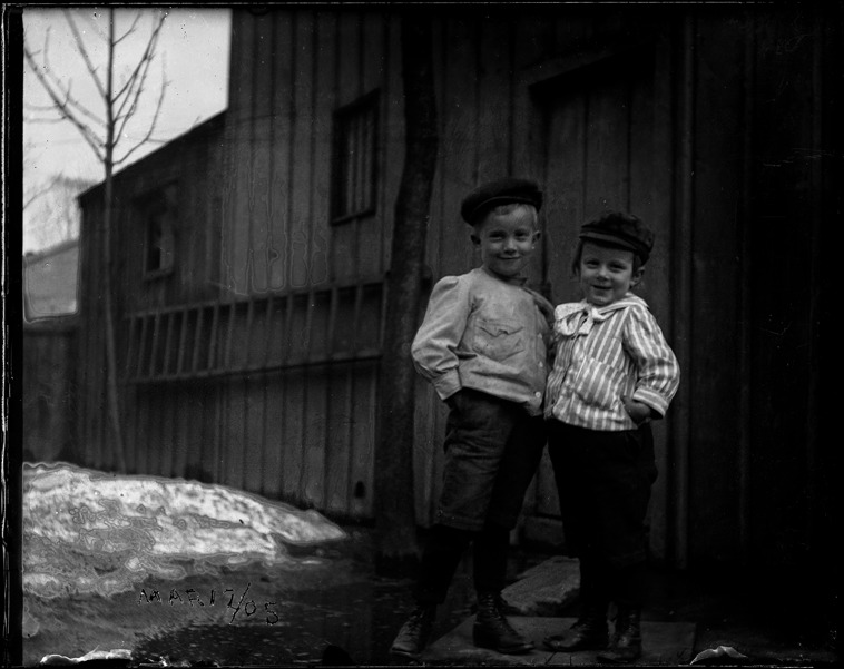 Two young boys wearing caps pose in front of wooden-frame building; ladder hangs from side of building. Recorded in glass negative ledger: "M/Localities-New Baltimore."