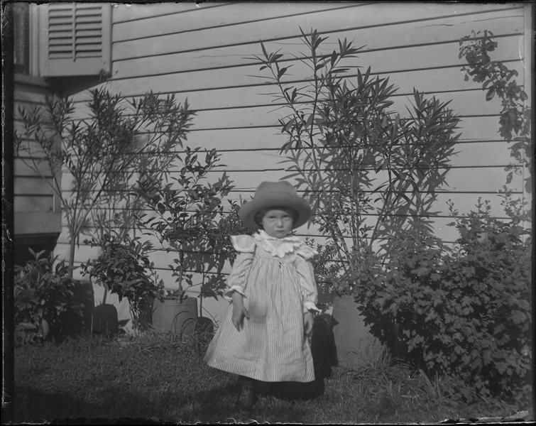 Young girl wearing dress and wide-brimmed hat poses outdoors next to wooden-frame house. Recorded in glass negative ledger: "M/Localities-New Baltimore."