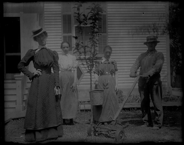 Three women stand near small tree in front of wooden-frame house; one woman holds a bucket; man pushes a hand-operated lawnmower. Recorded in glass negative ledger: "M/Localities-New Baltimore."