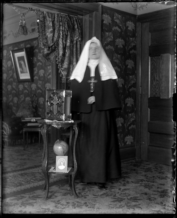 Favorite this☆ Portrait of nun Description: Nun stands next to small table that holds a Bible and globe. Recorded in glass negative ledger: "M/Localities-New Baltimore." Details Resource ID: EB02n292 Subject: Nuns--Michigan--New Baltimore Glass negatives Date Issued: Unknown year Format: 1 negative : glass ; 5 x 4 in. Member of: Burton Historical Collection Negative Number: BHC glass neg. no. 6027 Rights: Physical rights are retained by DPL. Copyright is retained in accordance with U.S. copyright laws.