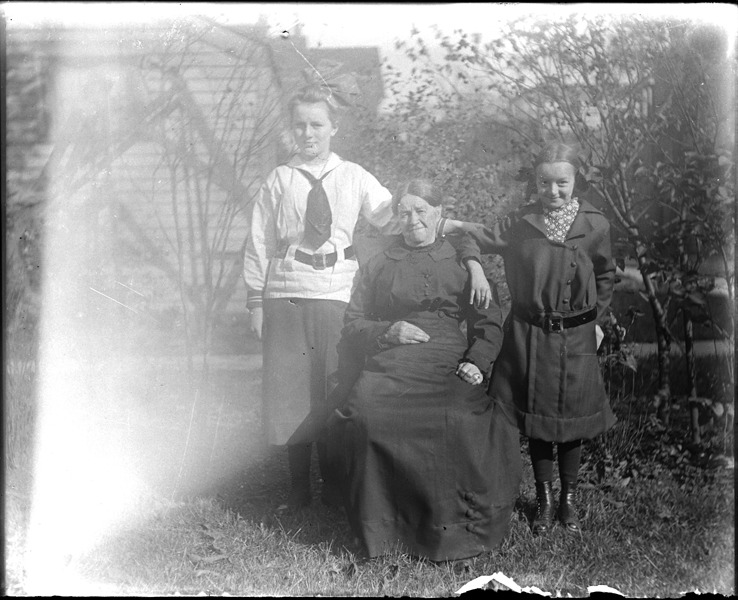 Woman and two girls pose outdoors. Recorded in glass negative ledger: "M/Localities-New Baltimore-Heuser family."