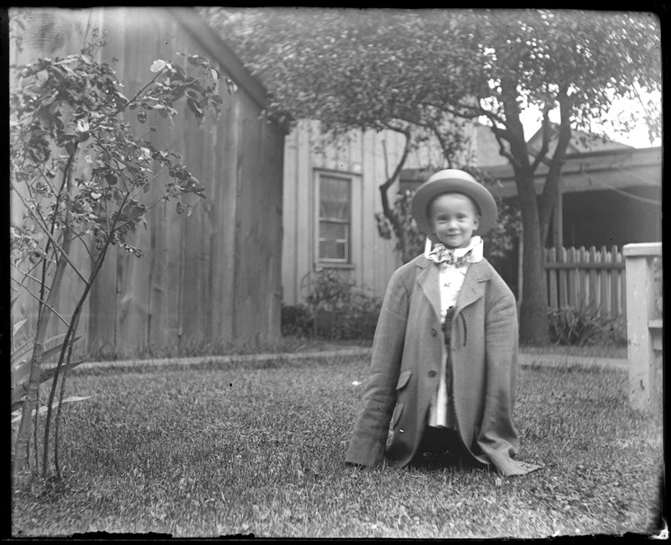 Young boy, wearing man's jacket and hat, poses in backyard. Recorded in glass negative ledger: "M/Localities-New Baltimore-Kuhn family."