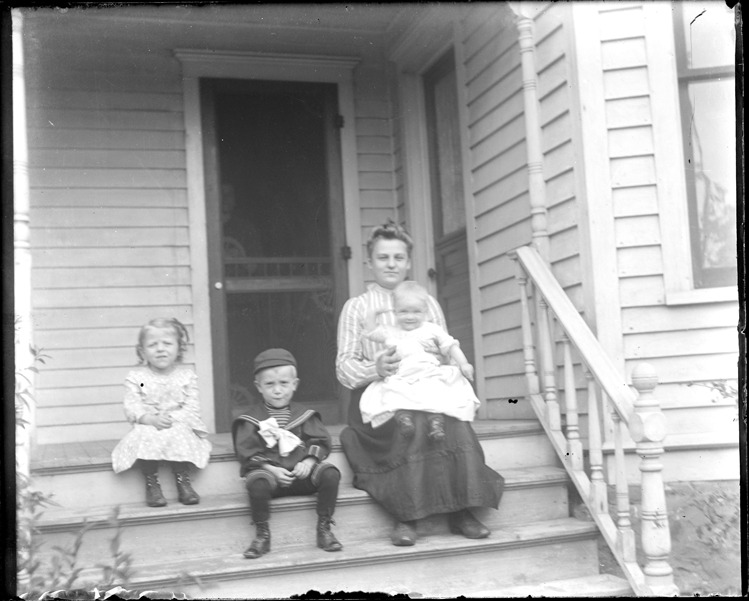 Favorite this☆ Woman and children in New Baltimore Description: Woman poses on steps of wooden-frame house with three children; woman holds one child in her lap. Recorded in glass negative ledger: "M/Localities-New Baltimore-Kuhn family." Details Resource ID: EB02n362 Subject: Women--Michigan--New Baltimore Children--Michigan--New Baltimore Kuhn family Glass negatives Date Issued: Unknown year Format: 1 negative : glass ; 4 x 5 in. Member of: Burton Historical Collection Negative Number: BHC glass neg. no. 6097 Rights: Physical rights are retained by DPL. Copyright is retained in accordance with U.S. copyright laws.