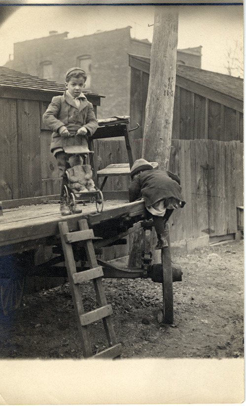 View of two boys playing with toy train cars on bed of large wooden wagon. Older boy pushing a stroller with a teddy bear. Handwritten on back: "Jackson Family."