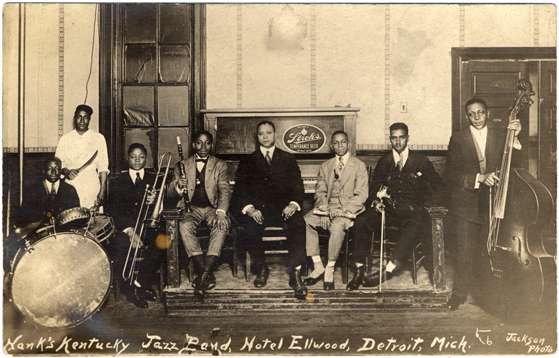 Hank's Kentucky Jazz Band on stage at the Hotel Ellwood in Detroit, Michigan. Six of the seven members are sitting down, man on right is standing with his cello, man holding long knife in the back left, upright piano in back, drums, trombone, clarinet, violin and cello are instruments used by the band. Handwritten on front: "Hank's Kentucky Jazz Band, Hotel Ellwood, Detroit, Mich. Jackson Photo."